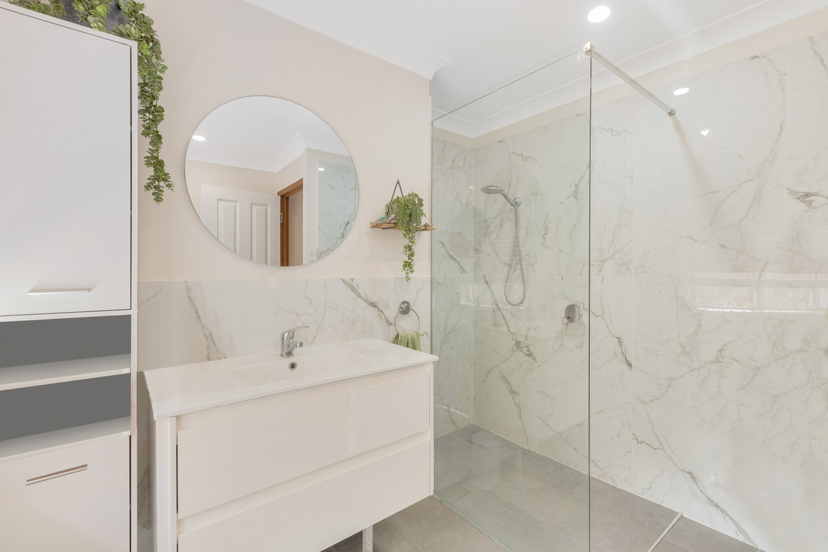 • Stylish renovated bathroom with chic floor to ceiling tiles